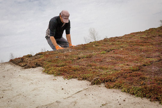 Na substrát Urbanscape Green Roll začnite zo stredu strechy jemne rozprestierať baly vegetačného krytu Urbanscape z rozličných druhov rozchodníka.