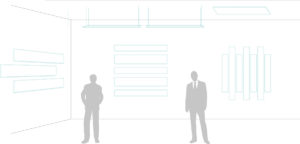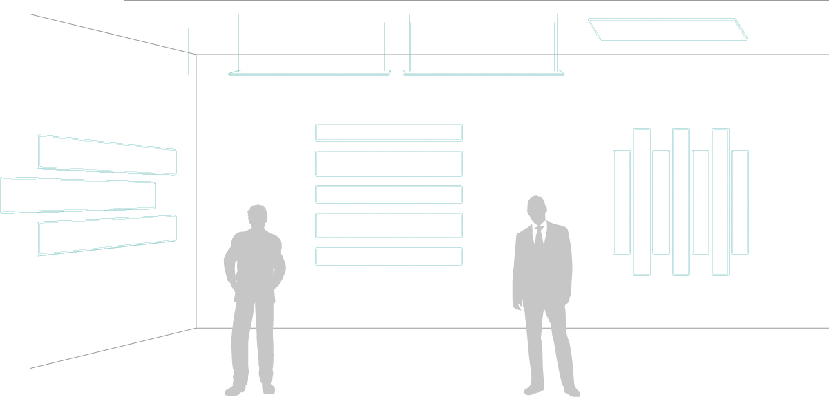 Prvok Rettangolo môže byť inštalovaný v zavesení pomocou oceľových káblov, magnetov priliehajúcich k stropu alebo jednoducho zavesených na stenu ako obrázok. Na požiadanie je možné potlačiť tkaninu panela pomocou atramentovej tlačiarne s vysokým rozlíšením .